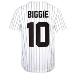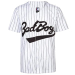 Bad Boy White Pinstripes Baseball Jersey features the 'badboy' logo on the front of the jersey. The baseball jersey is from Biggie Smalls's MV. 5 Colors available, black, yellow, white, red, and pinstripe white. The number of the jersey is 10.