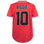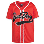 Bad Boy Red Baseball Jersey features the 'badboy' logo on the front of the jersey. The baseball jersey is from Biggie Smalls's MV. 5 Colors available, black, yellow, white, red, and pinstripe white. The number of the jersey is 10.