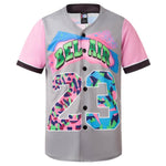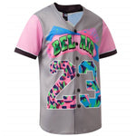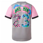90s Bel Air 23 Printed Baseball Jersey - Gray & Pink is inspired by the 90s TV series The Fresh Prince of Bel-Air. Unisex design graphic. Sublimation printed lettering. Great idea for the 90s theme parties, Hip-Hop dance uniform.