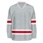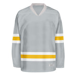 Our default template is a V-neck hockey jersey, but we can also create lace-tie neck designs. If you wish to change the stripes on the bottom or sleeves, we will do our best to accommodate your requirements. There are no extra fees and no minimum order quantity. Contact us or send us your custom design template.