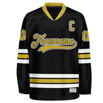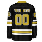 The modern black and gold color scheme hockey jersey. With embroidered lettering, the custom hockey jersey is durable and good-looking. The default letter logo is embroidered, and the graphic logo jersey will change to sublimate.