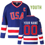 This hockey jersey is what Team USA wore in the 1980 Winter Olympics Games. You can fill in the player's name and number or leave them blank. We will custom-make the jersey for you. The jerseys feature stitched letterings, which make them durable and authentic-looking. And the custom jerseys are free shipping.