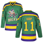 The Dave Karp Mighty Ducks Jersey is from the movie The Mighty Ducks D1. The hockey jersey features stitched names and numbers. It is custom-made, 4-5 weeks to ship out