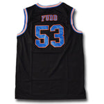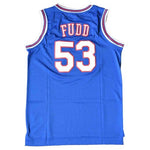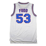 Elmer Fudd Space Jam Jersey is from the movie Space Jam (1996). The front of the jersey is the logo of Tune Squad. The back of the jersey is #53 and FUDD. The name and numbers are stitched.