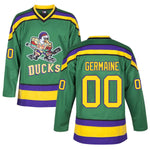 Guy Germaine jersey is from the movie The Mighty Ducks D1. The main color of the hockey jersey is green. The jersey features stitched logo, name and number.