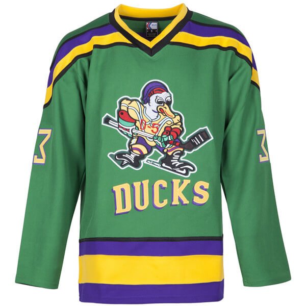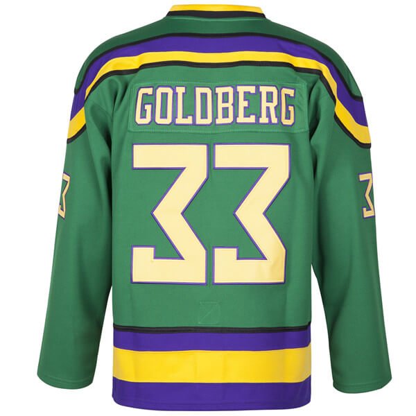 The Mighty Ducks Goldberg Jersey is from the 90s classic movie The Mighty Ducks D1 &D2. Greg Goldberg (Shaun Weiss) is a goalie and wears number 33. You can find the green jersey from D1 and the white jersey from D2.