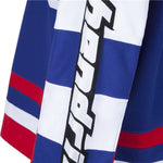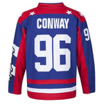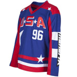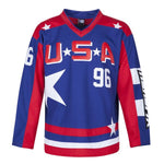 Mighty Ducks Team USA Jersey is from the kid's ice hockey movie D2: The Mighty Ducks. The Mighty Ducks Team USA jersey is sponsored by a fictional sports equipment company Hendrix. The primary color of the jersey are red and blue. The number of the jersey is #96. The names and numbers of the jerseys are all stitched.