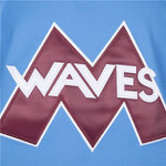 The color of the jersey is light blue. The logo is a big letter M that represents Minnehaha. The number of the Minnesota Waves jersey is #66. And the name and numbers of the jersey are all stitched.