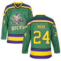The Peter Mark jersey is from the movie The Mighty Ducks D1. The hockey jersey features stitched lettering. And the jersey is the same as the costume in the film. It is custom-made, 2-4 weeks to ship.