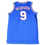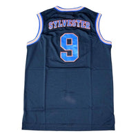 Sylvester Space Jam Jersey is from the movie Space Jam (1996). The front of the jersey is the logo of Tune Squad. The back of the jersey is #9 and SYLVESTER. The name and numbers are stitched.