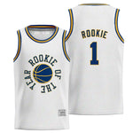 White Rookie of the Year Basketball Jersey - This jersey features stitched lettering and is custom-made. Please allow 2-4 weeks for shipping. If you need an urgent order, we can create a sublimation jersey, which takes around 2 weeks to ship. Leave a message in the 'other request' field, please.