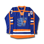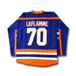 The Xavier LaFlamme jersey is from the classic hockey movie Goon. Xavier LaFlamme (Marc-André Grondin) is from France and plays hockey for the Halifax Highlanders. He wears the number 70 jersey and is the team's alternate captain. So, there's a letter 'A' on the left chest of his jersey.