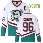 Youth Charlie Conway Mighty Ducks Jersey is from the kid's ice hockey movie The Mighty Ducks D2. The name and numbers of the jerseys are all stitched.